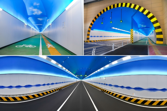 春喧路道路建設(shè)工程全長(zhǎng)1620米,其中玉皇山隧道長(zhǎng)1150米,單洞斷面寬度19.8米、高度13.6米,快車(chē)道11米,行人及非機(jī)動(dòng)車(chē)道4米。玉皇山隧道斷面采用左右線(xiàn)分離雙洞形式,每洞設(shè)置中隔墻,將機(jī)動(dòng)車(chē)道與人非通道徹底隔離,形成獨(dú)立車(chē)行和慢行孔洞,確保行人通行安全。隧道南口設(shè)置聲屏障,有效降低行車(chē)噪音對(duì)周邊居民小區(qū)、學(xué)校的影響。隧道北洞口采用彩繪施工工藝,與周?chē)h(huán)境融為一體,整體意境深遠(yuǎn),形成虛實(shí)對(duì)比。隧道內(nèi)以“山水泉城”為主題,設(shè)置泉城特色星空頂、藍(lán)天白云噴繪,極大提升整體觀感和行車(chē)舒適度。