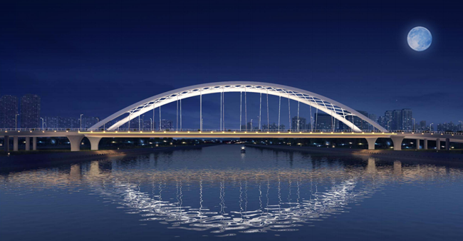 集團承建的二里橋路跨京杭運河節(jié)點工程(曲江大橋)項目連續(xù)上跨濱河西路、京杭運河、東外灘路(規(guī)劃),主橋采用“鋼箱提籃拱”結構,由拱肋和交織的橫撐組成,相依相靠,形成穩(wěn)定結構。設計靈感源自揚州“月亮城”的文化意象。側觀橋體,兩向內收攏的拱肋形如彎月,網(wǎng)狀橫撐交織成輕盈的弧線;夜間燈光亮起時,橋影與水中明月相映成趣,恰似“二分明月落長河”的詩意畫卷。橋型勾勒出了古樸靜謐的揚州,穿越千年,風姿如故,它宜清風、宜月色,人與自然相互包容,與揚州打造“文化旅游名城、生態(tài)宜居名城” 的規(guī)劃相得益彰。