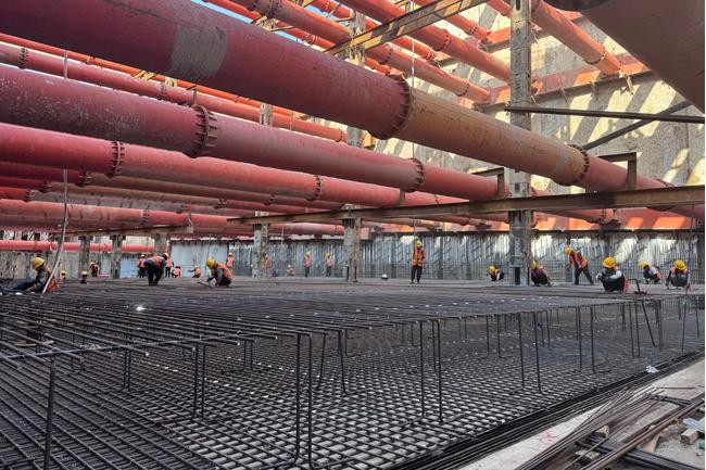 質(zhì)量管控方面,項目部實行全過程精細(xì)化管理。鋼筋工程嚴(yán)格執(zhí)行圖紙要求,對型號、間距、搭接等關(guān)鍵參數(shù)逐一驗收;混凝土澆筑采用串筒工藝保障澆筑質(zhì)量,技術(shù)人員全程旁站監(jiān)督,定時檢測坍落度指標(biāo)。振搗作業(yè)遵循標(biāo)準(zhǔn)化流程,對關(guān)鍵部位加強(qiáng)振搗力度?;炷脸跄皩嵤┒文▔汗に嚕行嵘Y(jié)構(gòu)自防水能力。經(jīng)過70個晝夜的連續(xù)施工,項目部高質(zhì)量完成全部23節(jié)底板的封底任務(wù)。